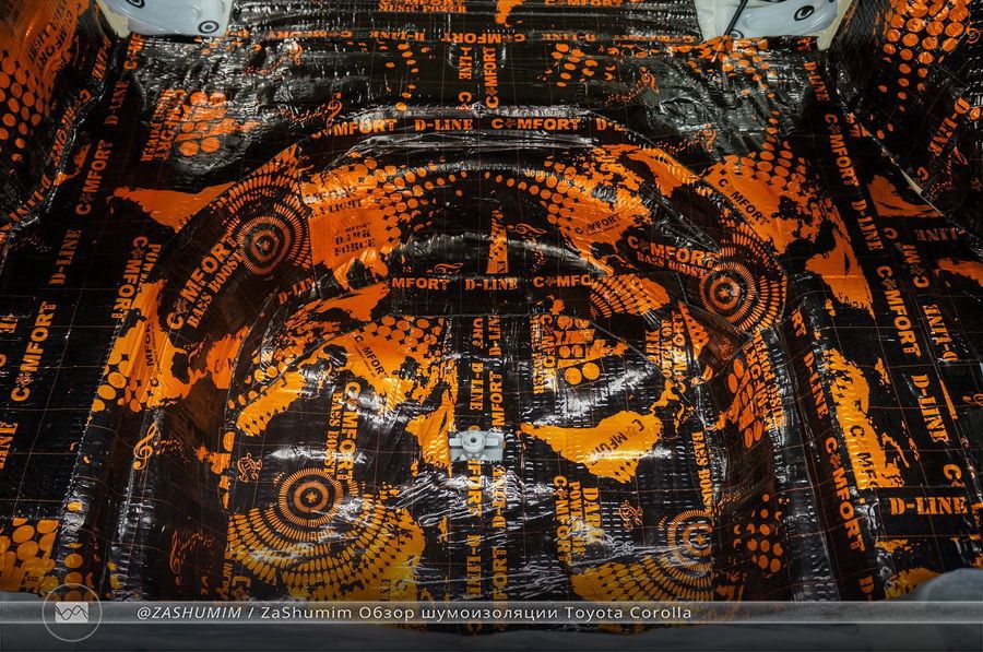 Следующим этапом будет шумоизоляция пола Toyota Corolla. В начале наши мастера прокладывают первый виброизоляционный слой материала Comfort mat D3. Его толщина в 4 мм, позволяет нам достигать высокого показателя по снижению уровня шумов в салоне автомобиля.